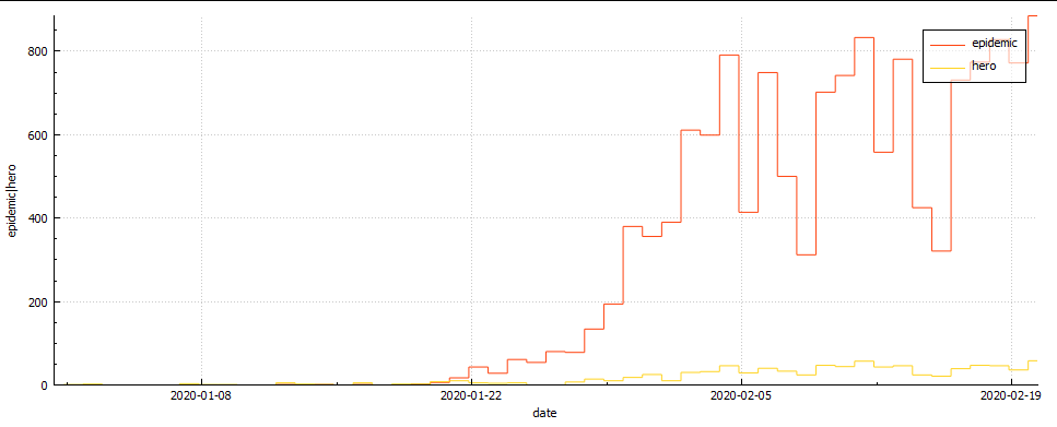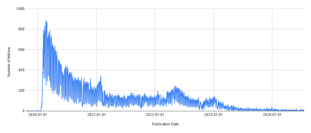 COVID related words dropping off a bit now. For example, a plot of the number of articles per day including 疫情: