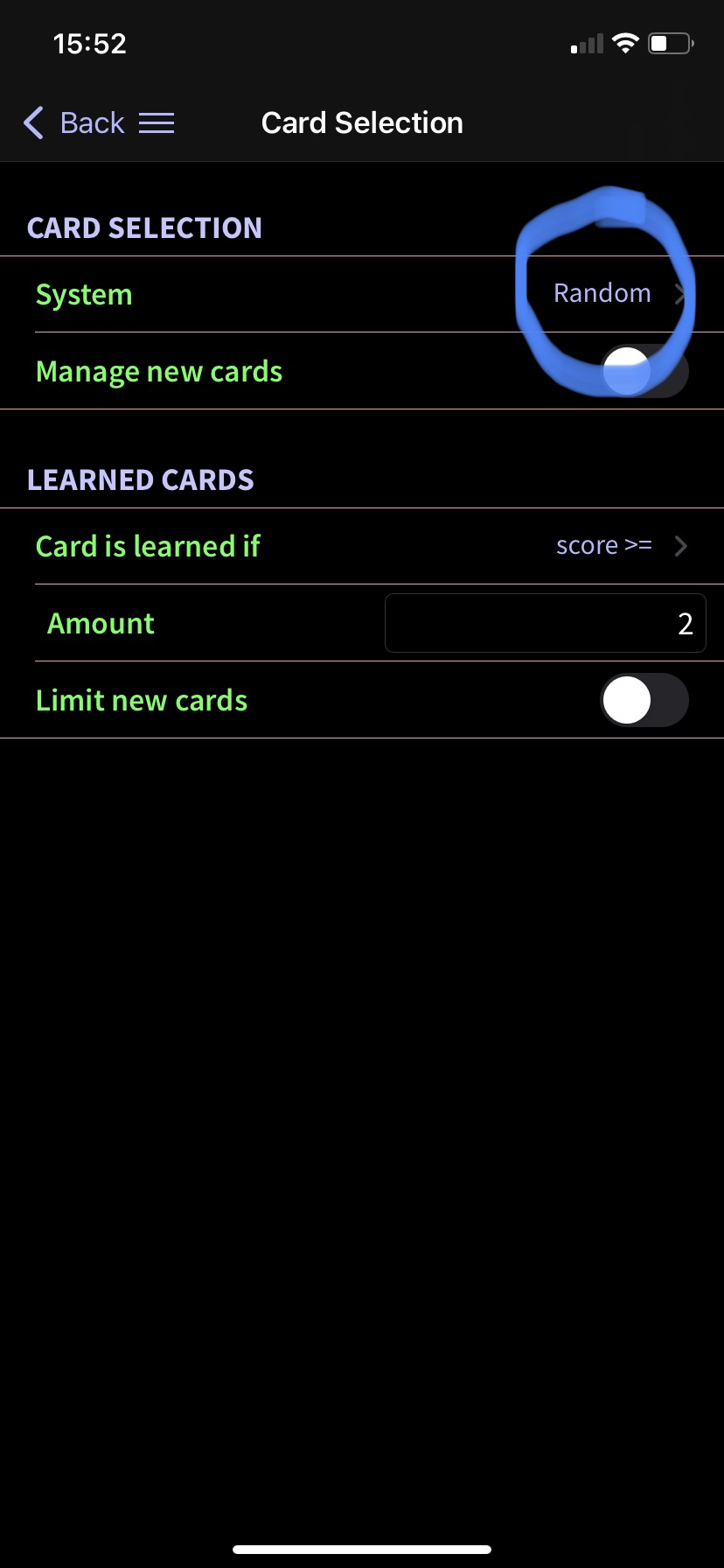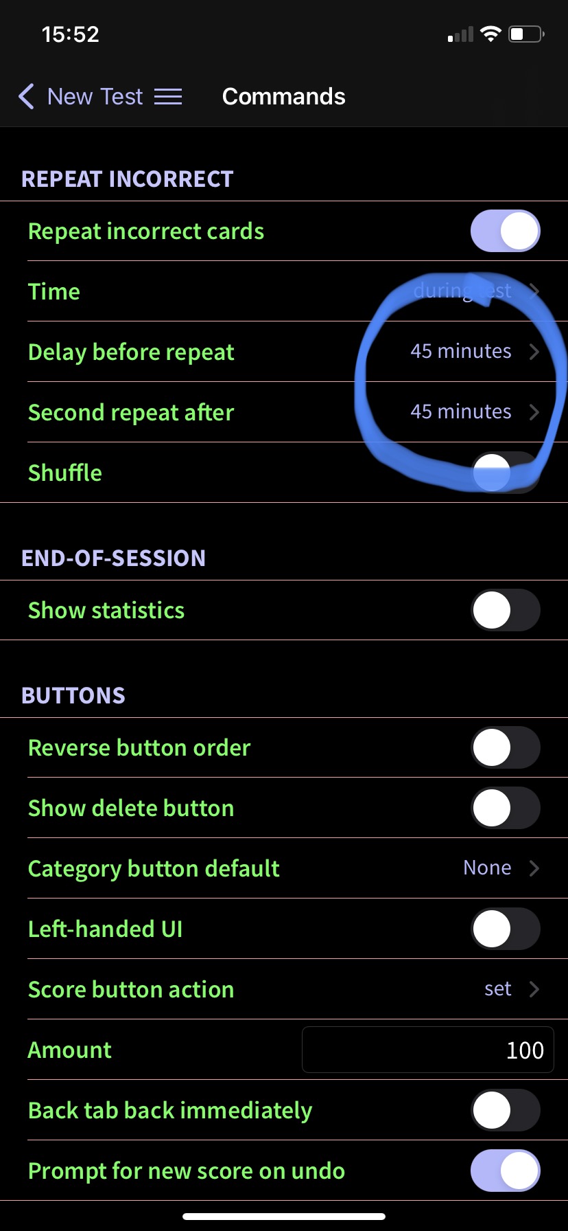 Not sure how to change that setting though. I looked inside the flashcard and can't find the "repeat if incorrect" option.